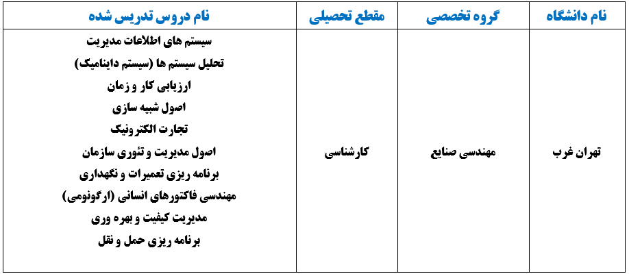 -مدرس دروس تخصصی گروه مهندسی صنایع ، دانشگاه آزاد اسلامی واحد تهران غرب ، از سال 96 تا کنون