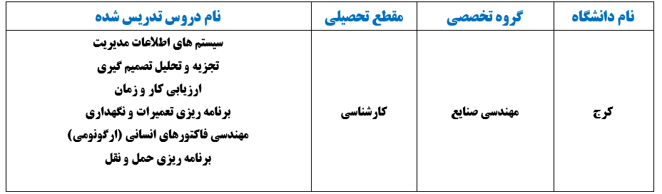 -مدرس دروس تخصصی گروه مهندسی صنایع، دانشگاه آزاد اسلامی واحد کرج ، از سال 95 تا کنون