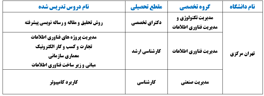 -مدرس دروس تخصصی گروه مدیریت فناوری اطلاعات و مدیریت تکنولوژی ، دانشگاه آزاد اسلامی واحد تهران مرکزی ، مقاطع دکتری و کارشناسی ارشد از سال 98 تا 1400